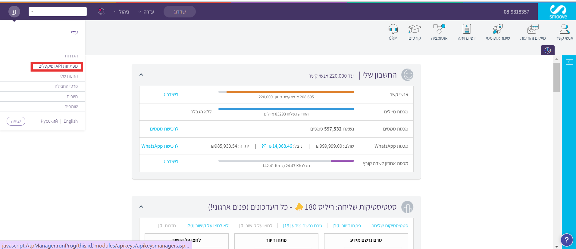 גשו לצלמית (icon) שם המשתמש בתפריט הראשי ובחרו בתפריט שנפתח את האפשרות "מפתחות API ופיקסלים".