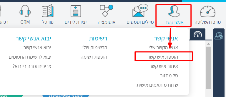יש להכנס ללשונית אנשי קשר ולבחור הוספת איש קשר.