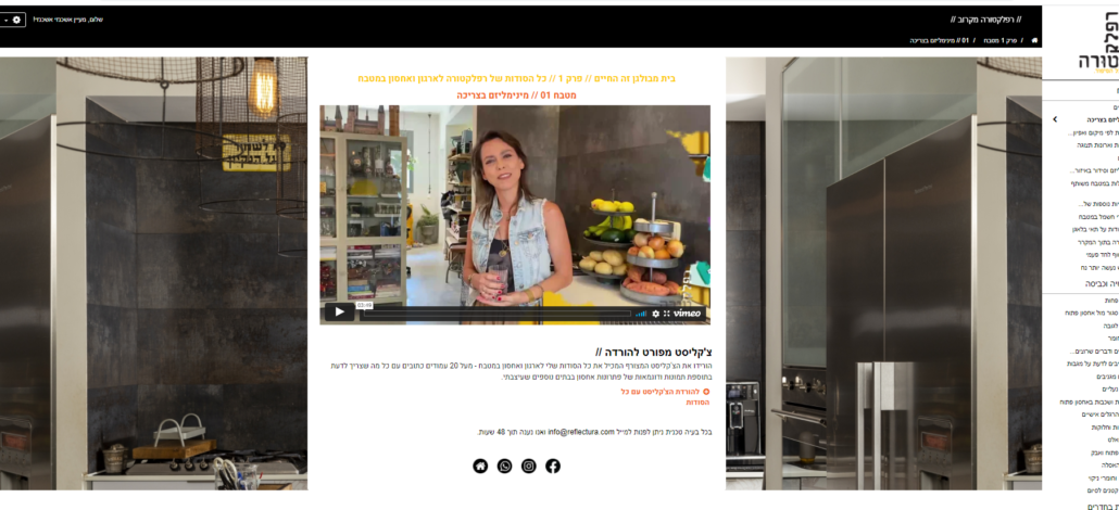 הפרקים בכוונה מפורקים לסרטונים קצרים, כי הבנתי שאנשים מתקשים לצפות במשהו כל כך ארוך. אז פירקתי כל נושא כזה לסרטונים קצרים עם פואנטה, באורך של בין 1-8 דקות. בנוסף, צירפתי גם צ'קליסטים כתובים שאפשר להדפיס, ובהם יש את כל התוכן הכתוב בטקסט, וגם תמונות נוספות שאפשר יהיה לראות עוד דוגמאות לנושאים שעליהם אני מדברת".