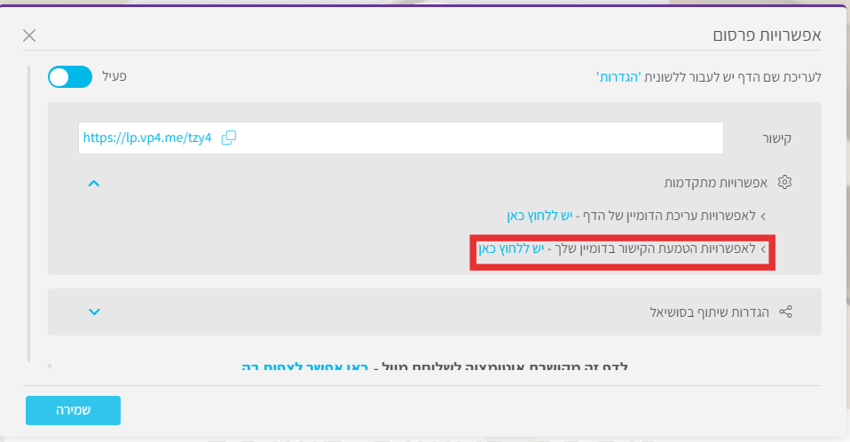 כדי לבחור סאבדומיין ייחודי שיחובר לדומיין של המערכת בוחרים ב"לאפשרויות הטמעת הקישור בדומיין שלך".